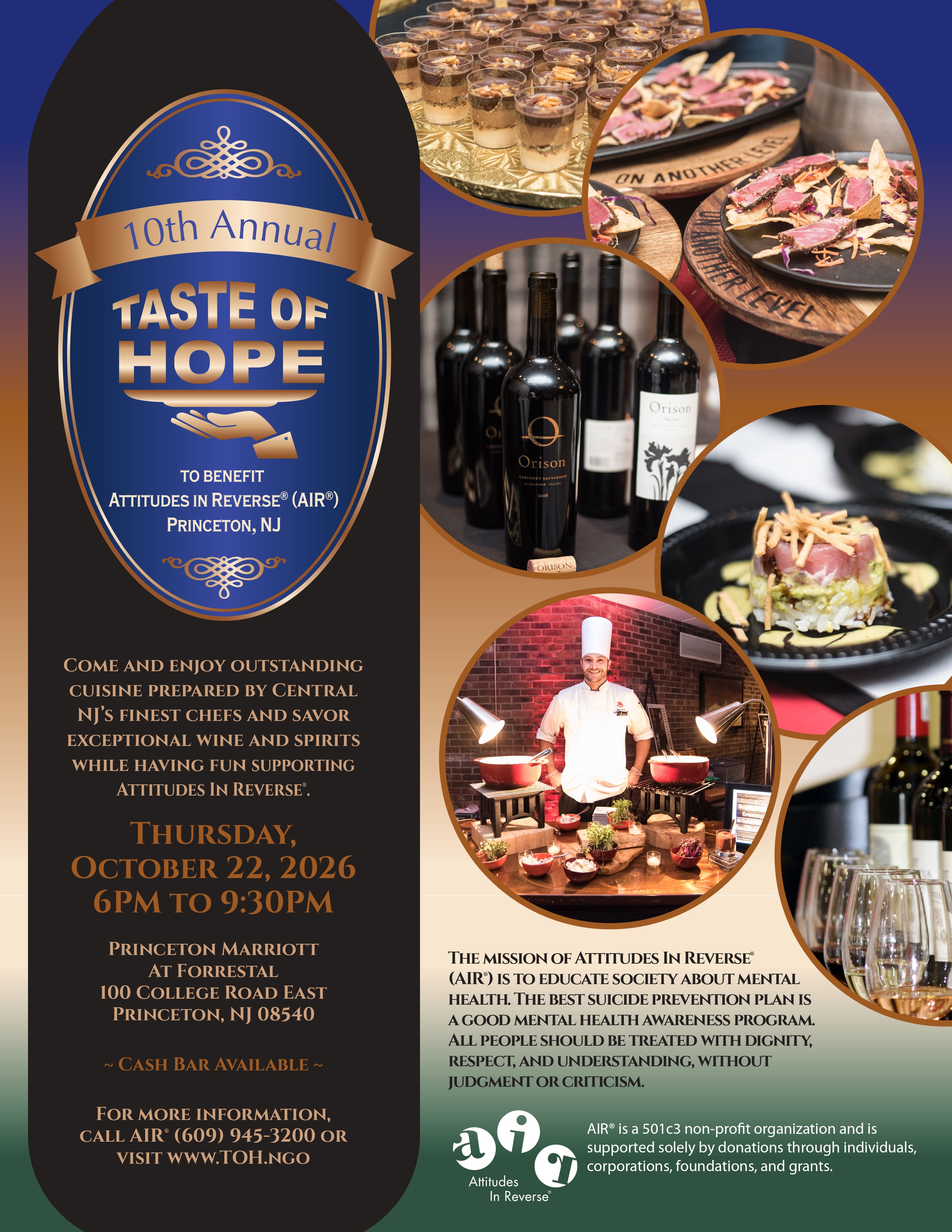 Come and enjoy outstanding cuisine prepared by Central NJ’s finest chefs and savor exceptional wine and spirits while having fun supporting Attitudes In Reverse®.
